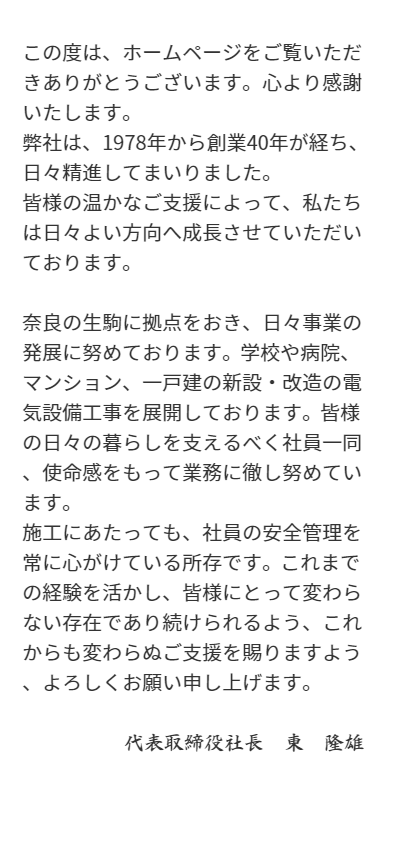 創業者の“東 京市”が自身の名前から、“東京”という社名を選びました。奈良県にある会社としては大変印象強く、皆様が覚えすいと親しみをもって頂けると喜びを感じながら社員一同、お客様を愛し社員を大切に日々業務に励んでいます。電気工事を専門とする“東京電気”は、創業40年を経て、さらなる発展を遂げられるよう邁進していく所存です。
